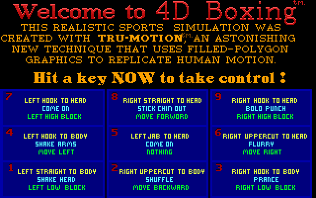 4D Boxing is a Playable Demo Sports game published by Electronic Arts in 1991.