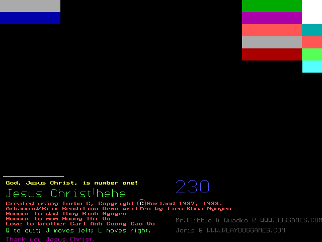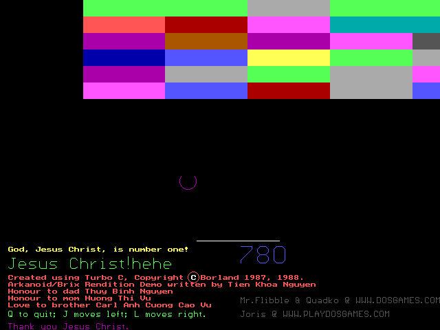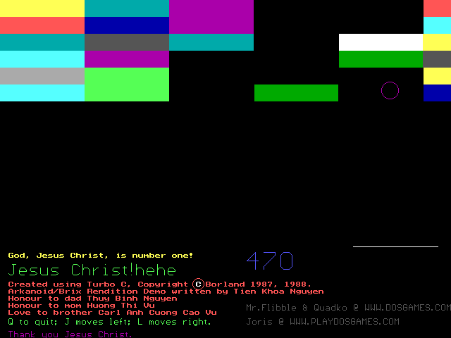ArkanDOS is a ball & paddle game made by Tien Nguyen, member of the DOS Games Discussion Forum.