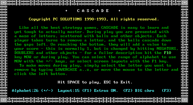 Cascade PC Solutions, 1993 Bookmark Download Cascade is a Shareware Strategy game published by PC Solutions in 1993. Category: Strategy License: Shareware Rating: rate now Language: English Share this game Facebook Twitter Reddit Game controls Use your mouse to play Cascade. Rating & comments No ratings yet Rate now
