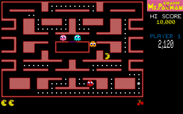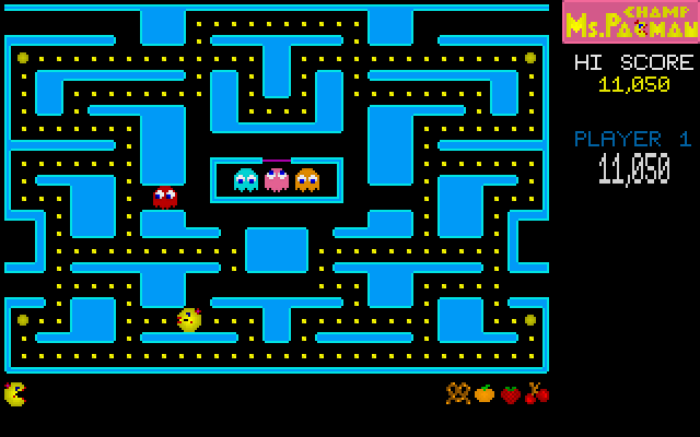 The object of CHAMP Ms. Pacman is to clear as many mazes as you can while accumulating the highest score possible. You must avoid the ghosts while eating the dots. In the four corners of each maze are power pills. When eaten, the ghosts turn blue for a short while. During this time, Ms. Pacman can eat the ghosts for more points. Sometimes, bonus fruit will enter the maze. Ms. Pacman can eat this fruit for points before the fruit leaves the maze. See the screen on Scoring and Credits for a full description of the scoring and bonuses. CHAMP Ms. Pacman is based on the Bally/Midway classic arcade game. This PC version was developed and programmed by CHAMProgramming. It is in no way intended to be presented as an original work, but merely as the IBM version of the coin-op game. Almost 6 months of work was put into this version to reproduce not only the look but the feel of the arcade game. We hope you enjoy the results.