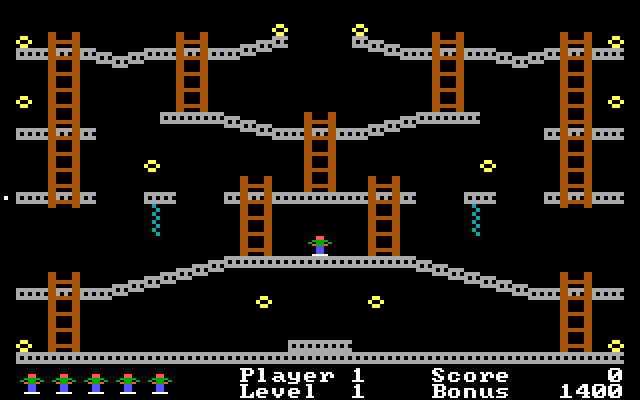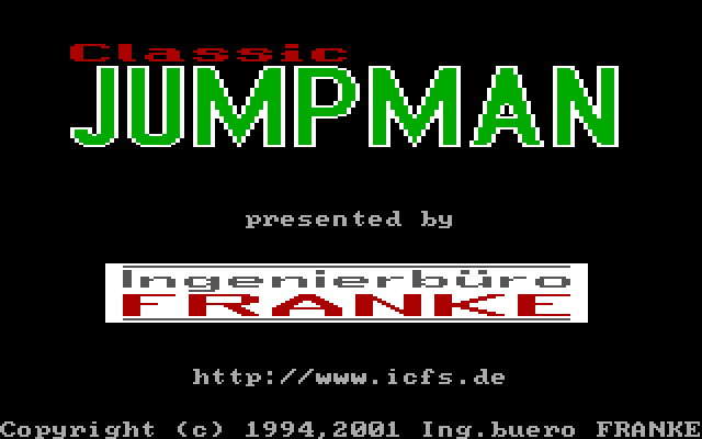 Years ago there was a game called ‘Jumpman’ running from a floppy boot disk for the IBM PC with 8088 at 4.77 MHz. Unfortunately this game was implemented in a way that makes it unplayable even with an 80286 at 6 MHz. The actual game ‘Classic Jumpman’ is mostly equivalent with the optic, sound, and course of the play of the original. However, it runs on any PC using DOS. If there is a Soundblaster compatible sound card installed, it will be detected and used for sounds and music.