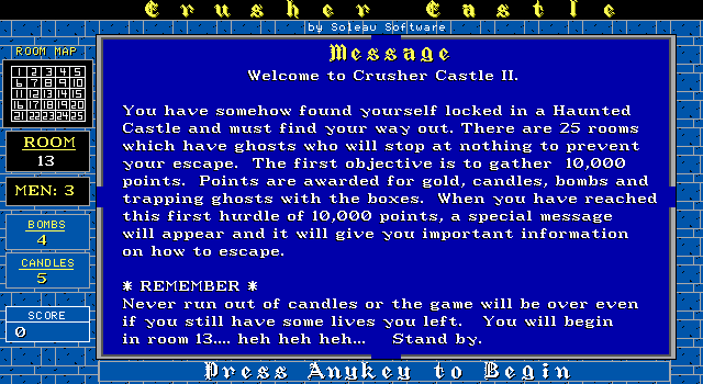 Crusher Castle 2 Soleau Software, 1995 Play now Bookmark Download Crusher Castle 2 is a Shareware Adventure game published by Soleau Software in 1995. Category: Adventure License: Shareware Rating: rate now Language: English Share this game Facebook Twitter Reddit Game controls - Left - Right - Up - Down Rating & comments No ratings yet Rate now