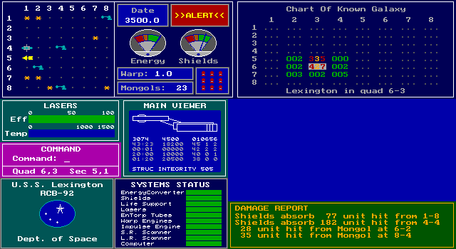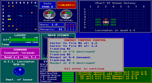 EGATrek simulates the captains console of a starship, and places you in command during an invasion by enemy ships. Your task is to conquer all enemy ships in your assigned portion of the galaxy, using your ship and its weapons as efficiently as possible. You are scored on the time you take to complete your mission (IF you complete it!), plus other bonuses such as rescues, number of enemy ships destroyed, etc.