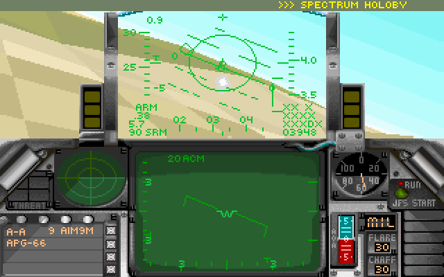The object of the demo version of Falcon 3.0 is to fly around the world and destroy any enemy plane you encounter. Any ground targets you find are enemy forces, so fire at will. Your game will end after about 10 minutes (when your fuel runs out) or if you are shot down. Keep a careful eye on your wingman; he’s out there to help save your hide. So, power up, happy hunting and check six for that MiG-29. He’s a killer.