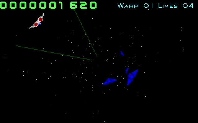 In G-Fighter you move around in a full 360-degree circle and shoot inwards towards enemies that fly outwards (and inwards) to group in the center. You cannot collide with enemy ships, however you can collide with: asteroids, enemy bullets (red stars), and shockers (blue electricity).
