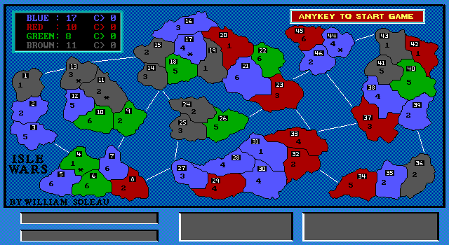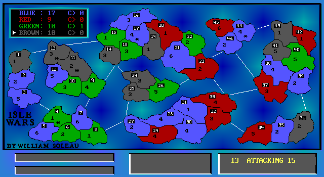 The object of Isle Wars is to conquer all nine islands with your armies. You play the Blue army and the computer plays the other three adversaries, the Green, Red and Brown.