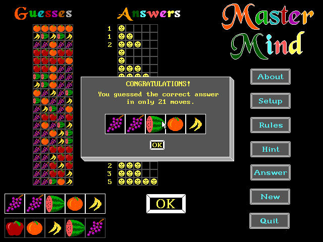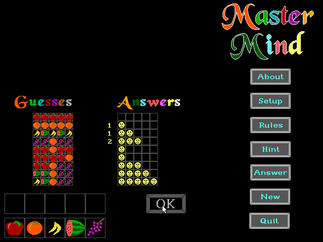 Master Mind Charles A Hardy, 1991 Bookmark Download Master Mind is a Shareware Puzzle game published by Charles A Hardy in 1991. Category: Puzzle License: Shareware Rating: rate now Language: English Readme files: MASTER.DOC Share this game Facebook Twitter Reddit Game controls Use your mouse to play Master Mind. Rating & comments No ratings yet Rate now