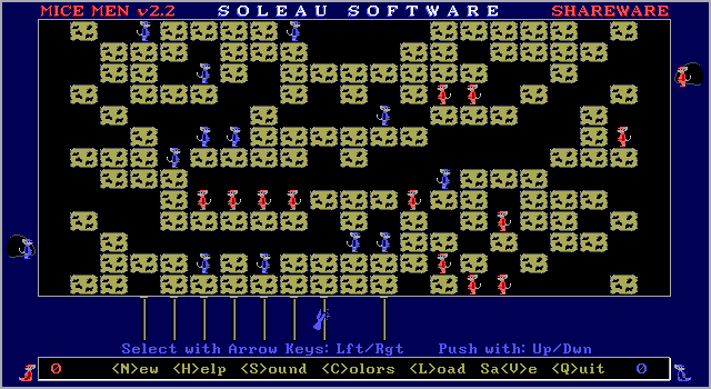 The object of Mice Men is to get all twelve of your color mice to the other end of the game board before your opponent does. In this version you will always be playing the blue mice and the computer will play the red mice.
