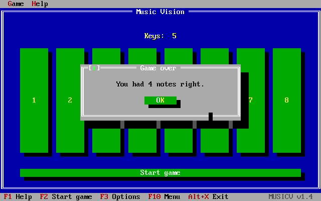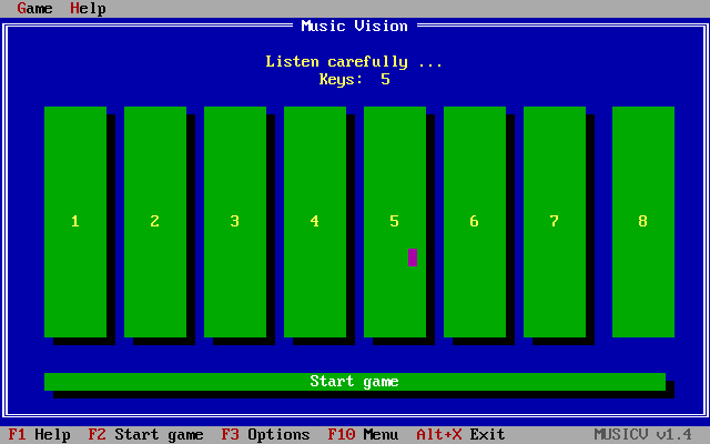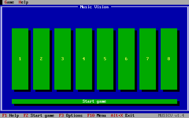 Music Vision is a menu-oriented DOS game to train your musical memory. You have to repeat a melody using numerical keys or a mouse. Each time you succeed, a melody with one more note is played and the game is repeated. The object is to reach the longest possible melody. With several options the difficulty level can be set from one suitable for small children to one that challenges professional musicians.