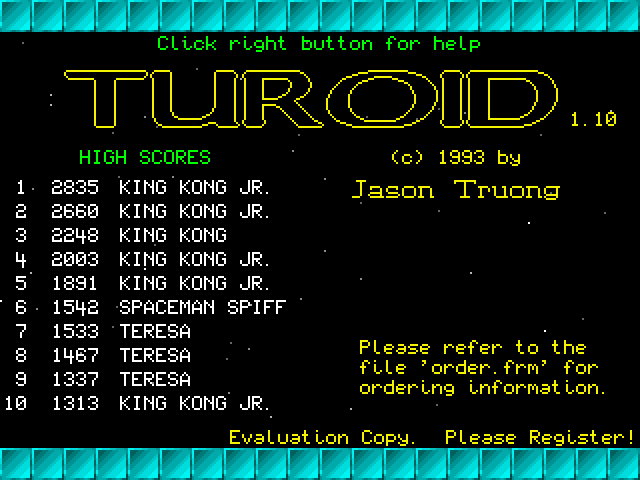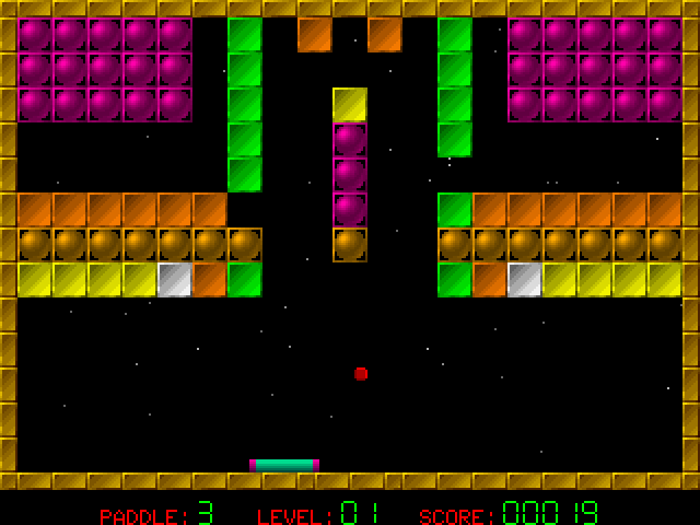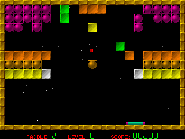 Turoid is a break-out type game. The purpose of the game is to destroy all the green, orange, and white bricks on the screen. The concept is similar to other ball-paddle games, but with many different features. For example, in Turoid, you can have up to 64 balls simultaneously on the screen, bonus shoot’em up levels, and a Level Editor.